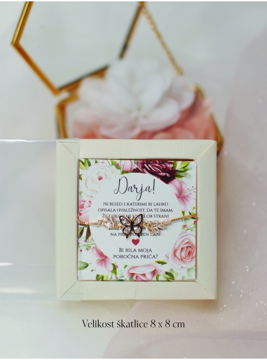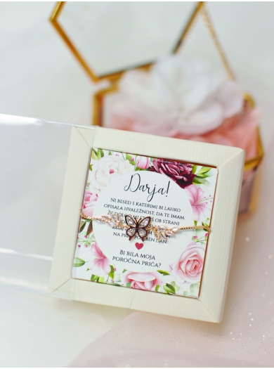 Izkažite svojo zahvalo poročni priči ali družici z elegantno zapestnico. Izdelana je iz visokokakovostne rosegold nerjaveče kovine, njen simbol metulja pa je prefinjeno okrašen z bleščečimi kristalčki.