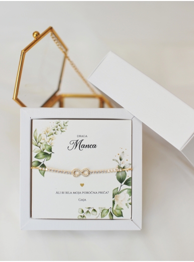 Bodi moja poročna priča!V znak hvaležnosti za podporo in ljubezen podarite čudovito zapestnico z motivom neskončnosti, ki simbolizirata prijateljsko vez. Zapestnica je shranjena v personalizirani embalaži – popolno darilo, za tvojo drago osebo.Podrobnosti o darilu: