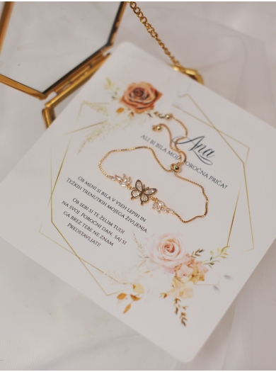 Izkažite svojo hvaležnost poročni priči ali družici z elegantno zapestnico. Izdelana je iz visokokakovostne rosegold nerjaveče kovine, njen simbol metulja pa je prefinjeno okrašen z bleščečimi kristalčki.
