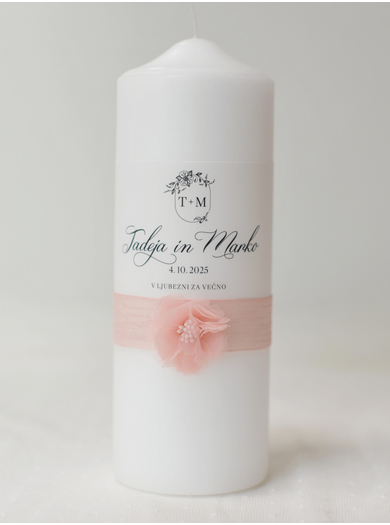 Bela poročna sveča s personaliziranim ovitkomPraznični navdih za vaš nepozaben poročni dan: prefinjena bela sveča, obdana z ovitkom po meri, na katerem sta natisnjeni vajini imeni in datum poroke. Popolna kombinacija elegance in simbolike, dekorirana s trakom in cvetom v pastelno roza barvi.