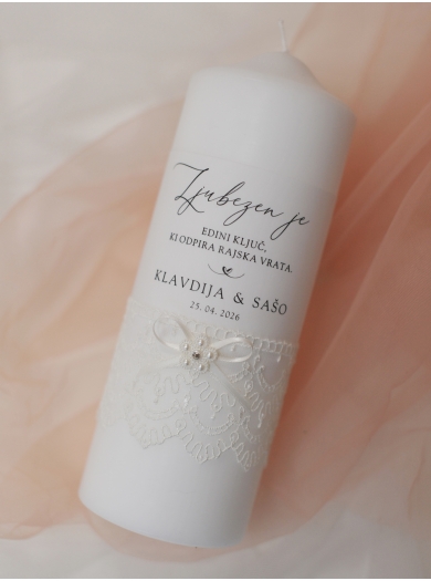 Bela poročna sveča z elegantnim potiskanim ovitkom, na katerem so natisnjena imena in datum poroke (verz je možno spremeniti / prilagoditi vaših željam). Sveča je dekorirana s prefinjeno čipko, pentljo ter kristalom v obliki cveta, ki ji daje romantičen in svečan videz.