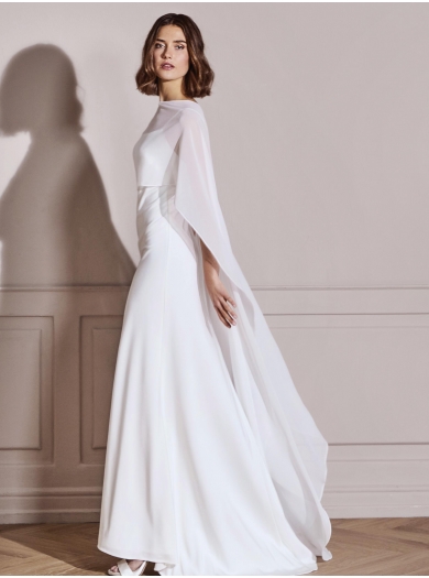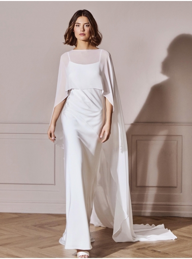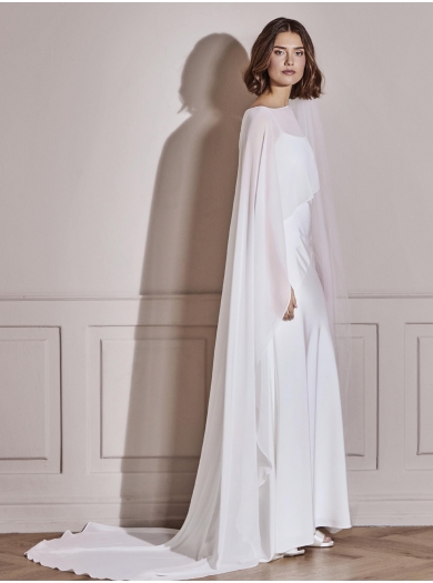 Poročno ogrinjalo iz žoržeta v dolžini tal, ki vašemu poročnemu videzu doda pridih sodobne elegance. Lahka, delno prosojna tkanina se čudovito ovije okoli ramen ter ob vsakem koraku mehko valovi — prefinjena alternativa klasičnemu tančici.