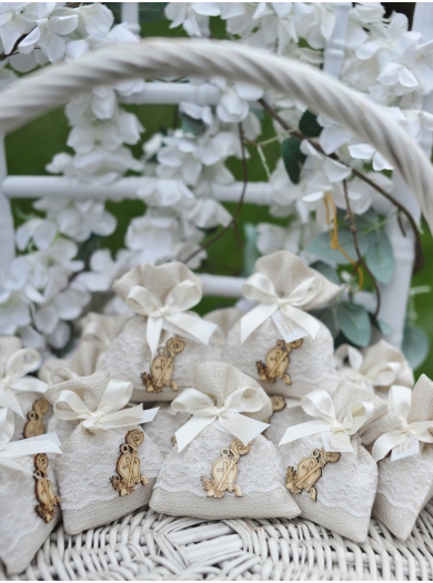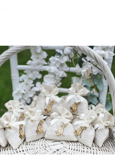 Elegantni konfeti za sveto birmo v obliki ljubkega žakeljčka v nežnih pastelnih tonih. Okrašeni so z dekorativno čipko in dopolnjeni z leseno figuro škofovske kape, ki simbolično poudari pomen dogodka.