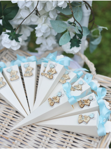 Ljubki konfeti za krst vašega malčka, sestavljeni iz škatlice v obliki korneta, dekorirani s figurico modrega medvedka.