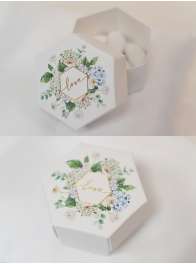 Ljubka škatlica v obliki 6-kotnika s cvetlično grafiko in napisom LOVE. V škatlici je 5 konfetnih bonbonov.