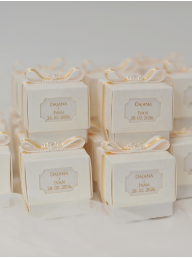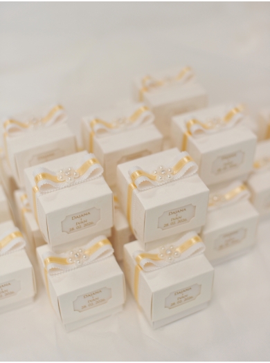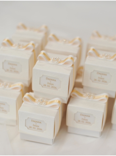 Elegantni poročni konfeti v obliki ljubke škatlice. Dekoracija je v rumeno-zlati barvi. Na vrhu konfete krasi cvet s perlicami in kristalom. V škatlicah je 5 konfetnih bonbonov. Personalizirani kartončki, vpeti v škatlico so že vključeni v ceno konfetov (osnutek imen prejmete pred tiskom v predogled).