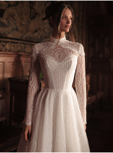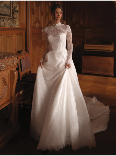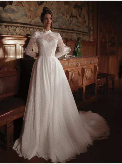 Poročna obleka Tayra v kroju A-linije združuje klasično eleganco in romantične detajle. Izdelana je iz nežne gipure čipko z dovršenim vzorcem, s polprosojnim zgornjim delom in visokim čipkastim ovratnikom. Korzet s srčastim izrezom ter bogato okrašena ramena z bleščicami in perlami ustvarjajo prefinjen videz, ki ga dopolnjujejo dolgi rokavi in razkošen vleček.