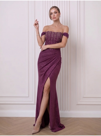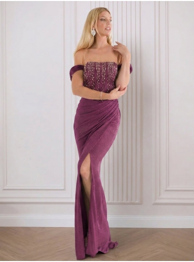 Elegantna svečana obleka, primerna za različne posebne priložnosti, kot so matura, poroke, sprejemi, obletnice ali vodenje dogodkov. Oprijet kroj lepo poudari silhueto, visok razporek pa doda pridih drznosti in ženstvenosti. Raven, skrbno oblikovan životec je obogaten s sijočimi kristali, ki ustvarijo prestižen in glamurozen videz.