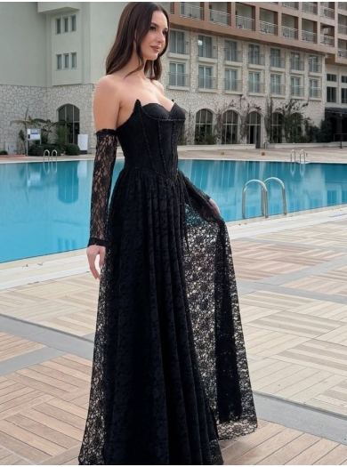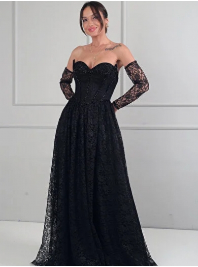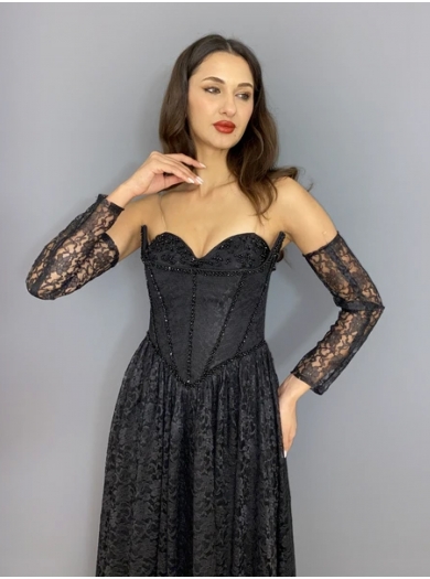 Trendovska svečana obleka v brezčasni črni barvi, izdelana v celoti iz elegantne čipke, združuje prefinjenost in sodoben stil. Teliran životec lepo poudari silhueto, medtem ko krilo v A-liniji poskrbi za ženstven in lahkoten padec. Poseben čar obleki dodajo čipkasti rokavi, ki ustvarijo dovršen in eleganten videz.