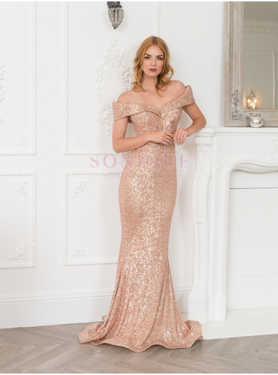 Dolga, oprijeta svečana obleka v rosegold barvi s privlačnim srčastim izrezom. Obleka je izdelana iz svetleče tkanine z zlatimi nitmi ter s prefinjeni detajli, ki ji daje čaroben sijaj, in ima čudovit kroj, ki lepo poudari vašo eleganco.