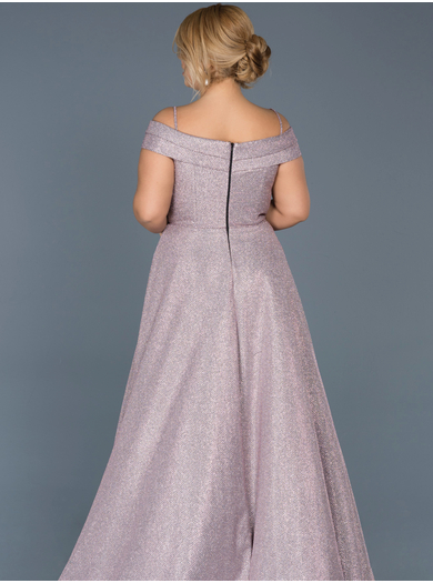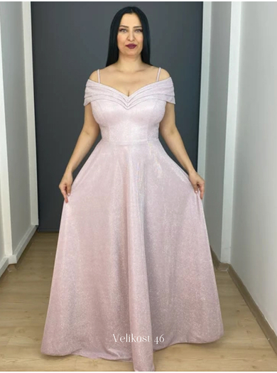 Čudovita svečana obleka, zasnovana posebej za ženske z izrazitejšo postavo, zagotavlja popolno prileganje in odlično oporo tudi pri večjem oprsju. Izdelana je iz bleščečega glitter materiala, ki nežno lovi svetlobo in ustvarja razkošen sijaj. Romantičen off shoulder izrez elegantno poudari ramena ter doda pridih zapeljivosti in prefinjenosti.