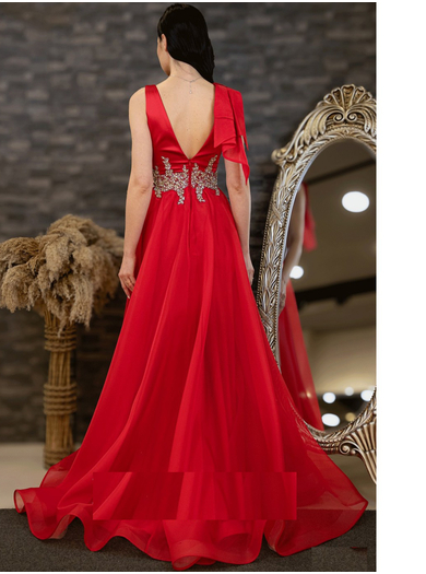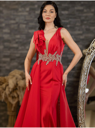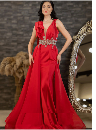 Svečana obleka v ognjeno rdeči barvi očara z razkošno, unikatno tkanino in sijočimi kristalnimi detajli. Poudarjen pas elegantno oblikuje silhueto in poudari ženstvenost.