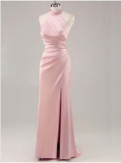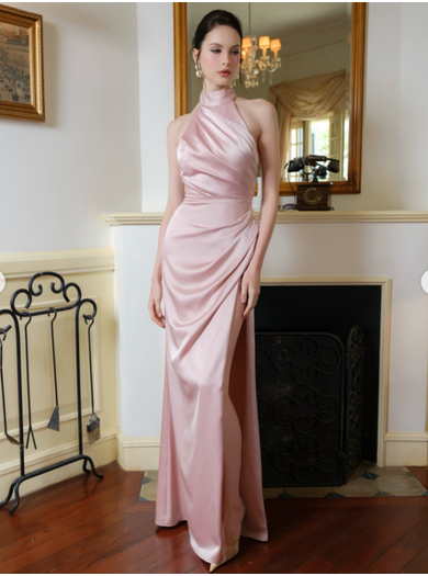 Svečana obleka iz mehkega satena v prefinjenem odtenku dusty pink, ki se čudovito ujema z različnimi barvami moških oblek. Posebnost modela je eleganten halter ovratnik z zaprtim dekoltejem, ki optično podaljša vrat in ustvari vitko, graciozno silhueto.