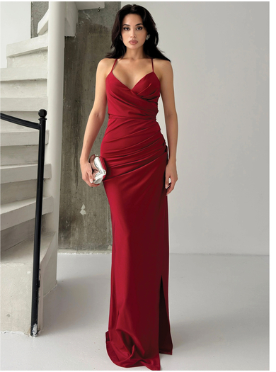 Zažarite v čudoviti svečani obleki oprijetega kroja, izdelani iz mehke in elastične tkanine, ki lepo poudari postavo. Razporek na krilu doda pridih zapeljivosti in elegance.