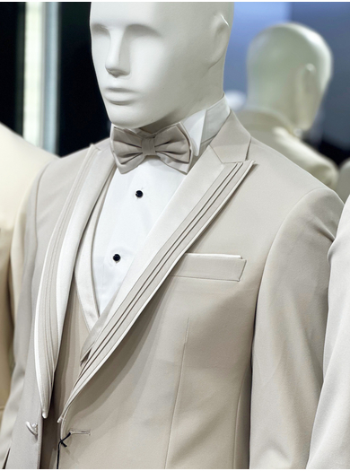 4-delna svečana moška poročna obleka v bež barvi, ki vključuje tudi telovnik, je lahko izvrstna izbira za posebne priložnosti, kot je poroka ali formalni dogodek. Bež barva je vsestranska, ki se dobro poda različnim slogom poroke.