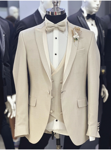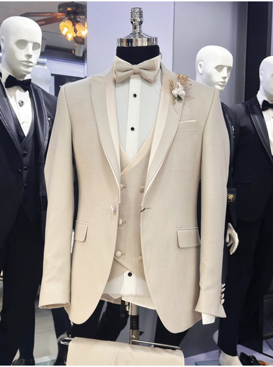 4-delna svečana moška poročna obleka v bež barvi, ki vključuje tudi telovnik, je lahko izvrstna izbira za posebne priložnosti, kot je poroka ali formalni dogodek. Bež barva je vsestranska, ki se dobro poda različnim slogom poroke.