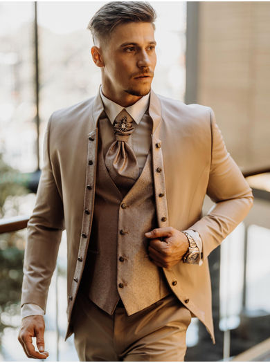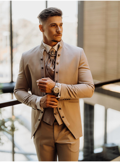 Eleganten komplet moške poročne obleke v prefinjenem bež odtenku je popolna izbira za ženine, ki želijo klasično eleganco z modernim pridihom.