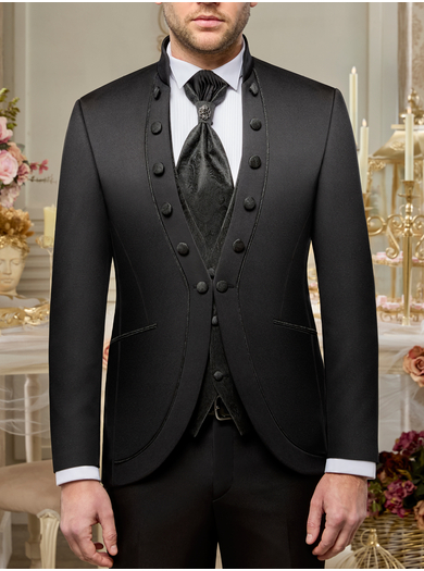 Svečana štiridelna moška poročna obleka v brezčasni črni barvi z razkošnimi detajli. Telovnik in svečana kravata sta izdelana iz brokatne tkanine. Popolna izbira za ženina, ki želi na svoj poročni dan izžarevati prefinjenost, samozavest in brezčasno eleganco.