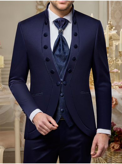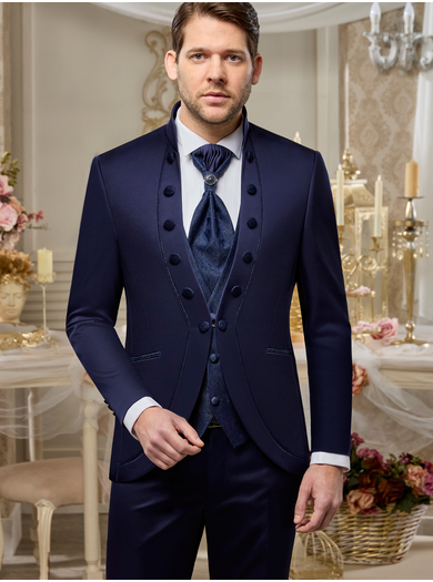 Svečana štiridelna moška poročna obleka v elegantni modri barvi z razkošnimi detajli. Telovnik in svečana kravata sta izdelana iz brokatne tkanine. Popolna izbira za ženina, ki želi na svoj poročni dan izžarevati prefinjenost, samozavest in brezčasno eleganco.