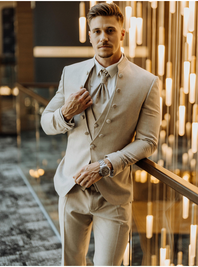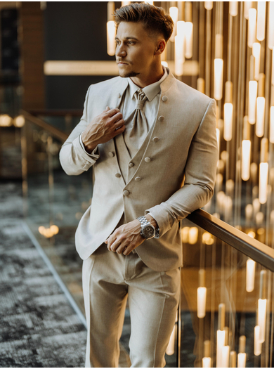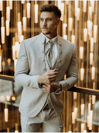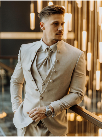 Svečana moška poročna obleka v bež barvi združuje eleganco, prefinjenost in unikatne detajle. Natančno zasnovana obleka se ponaša z modernim visokim ovratnikom z dekorativnimi gumbi, ki ji dajejo prefinjen videz in poudarijo njeno edinstvenost. Suknjič, ki se zapira z enim gumbom, natančno oblikuje silhueto, medtem ko za močnejše postave priporočamo uporabo verižice, ki zagotavlja dodatno udobje in boljšo postavitev obleke.