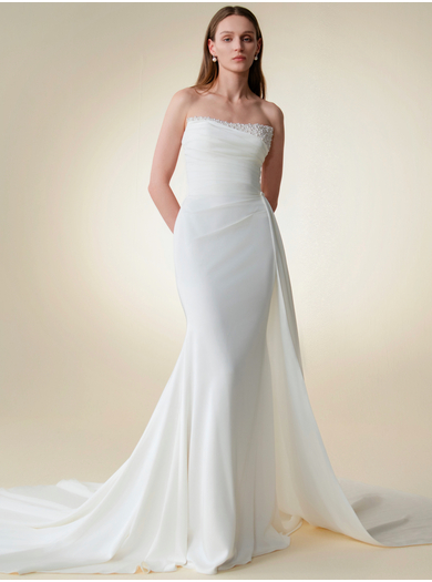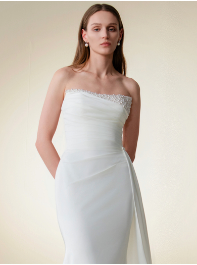 Ta čudovita poročna obleka je ustvarjena za neveste, ki prisegajo na čistost linij in prefinjeno eleganco. Izdelana je iz vrhunske tkanine, ki lepo pada in se popolno prilagodi silhueti. Posebno pozornost pritegne zaprti životec, okrašen z nežnimi kristalnimi detajli, ki dodajo pridih razkošja in subtilnega sijaja.
