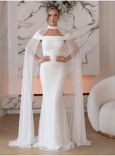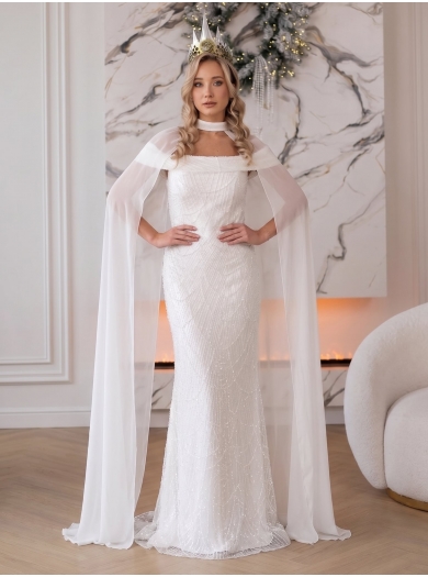 Poseben čar obleki doda šifonast cape, ki lahkotno objame silhueto in ustvari romantičen, skoraj pravljičen videz.