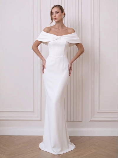 Elegantna poročna obleka, ki nežno sledi liniji telesa. Krojena je z ravnim, ladijskim izrezom, ki čudovito poudari ramena in dekolte. Tkanina je posuta z drobnimi perlicami in kristalčki, ki ustvarjajo subtilen, prefinjen lesk.