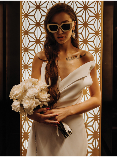 Gladko satenasta poročna obleka oprijetega kroja s čudovitim asimetričnim izrezom in stopničasto krojenim krilom združuje sodobnost in brezčasno eleganco.