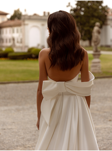 Dizajnerska poročna obleka iz satena z asimetričnim životcem in čudovitim hrbtnim delom je izjemno elegantna in privlačna. Zapeljiv razporek odprt od spodnjega dela obleke navzgor in ustvarja seksi, a še vedno eleganten videz. Razporek lahko poudari noge in dodaja pridih zapeljivosti. Obleka ima eno naramnico, kar ji daje edinstven videz. Ena naramnica lahko poudari ramo in vratno linijo ter dodaja subtilno eleganco.