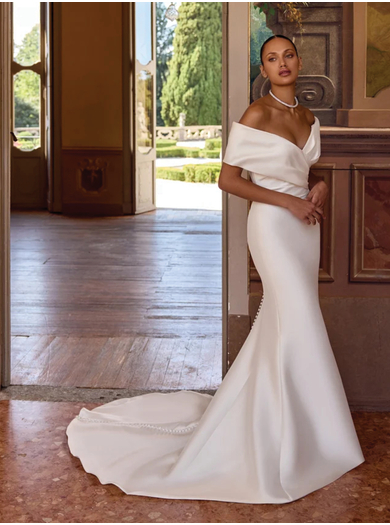 Elegantna poročna obleka, izdelana iz gladkega satena, navdušuje s čistimi linijami in brezčasno prefinjenostjo. Osupljiv off-shoulder izrez doda pridih romantične zapeljivosti, hkrati pa ohranja klasično eleganco.