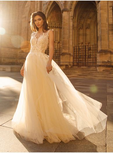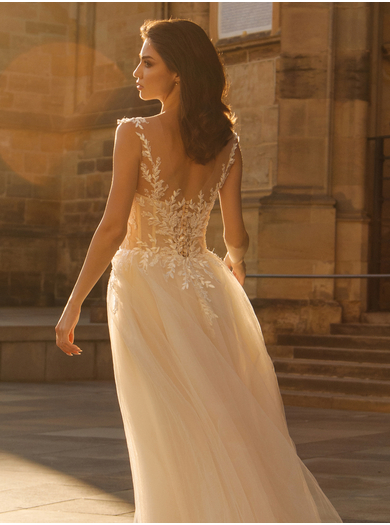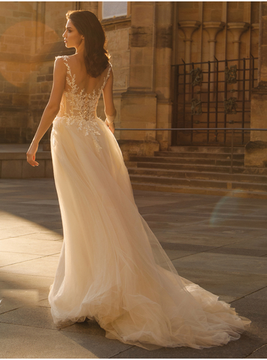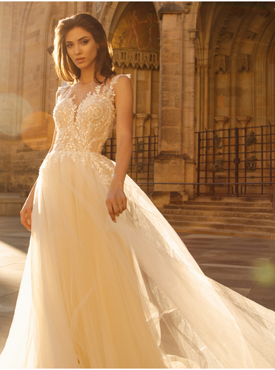 Razkošna poročna obleka z naramnicami, ki nudijo oporo za prsa, z zgornjim delom prekritim s čipko in večslojnim krilom iz tila izgleda čudovito! Ta slog obleke je lahko zelo eleganten in romantičen.