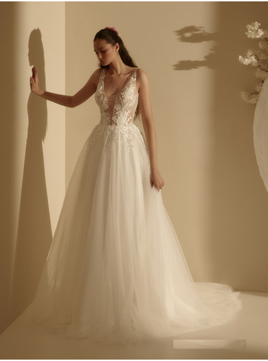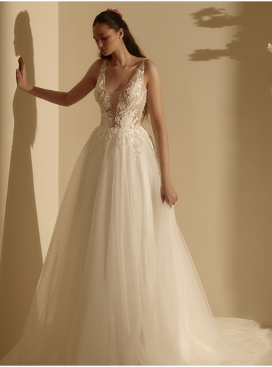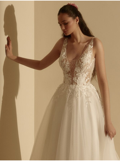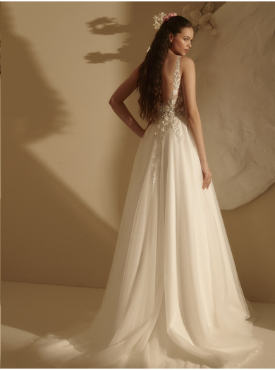 Čudovita poročna obleka A kroja je idealna izbira za neveste, k želijo svoj dan preživeti sproščeno. Obleka ima čipkast životec z nežnimi naramnicami, ki zagotavljajo odlično oporo za prsi. Eleganten hrbet z nežnimi detajli lepo oblikuje postavo. Večplastno krilo iz nežnega tila čudovito zaobjame nevestino silhueto, kar prispeva k prefinjenemu in očarljivemu videzu.