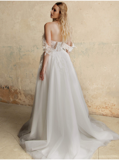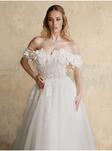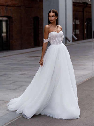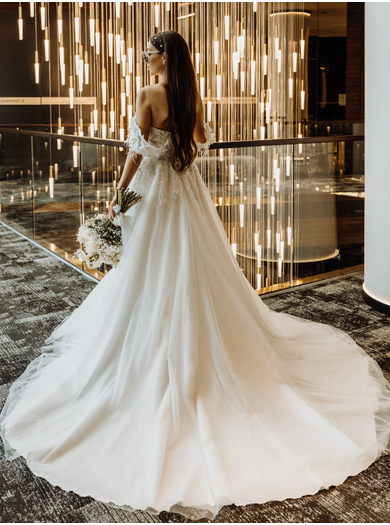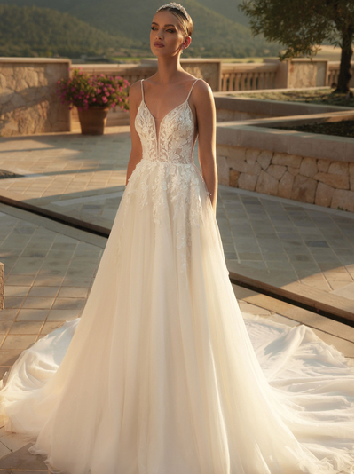 Romantična poročna obleka princess kroja je idealna izbira za neveste, ki obožujejo lesk in prefinjene detajle. Obleka se ponaša s čvrstim životcem in nežnimi padajočimi naramnicami iz čipke, ki dodajo kanček elegance. Podložen hrbet lepo poudari postavo in zagotavlja udobje. Večplastno krilo iz glitter tula čudovito zaobjame nevestino silhueto, kar ustvarja sanjski videz za vaš poseben dan.