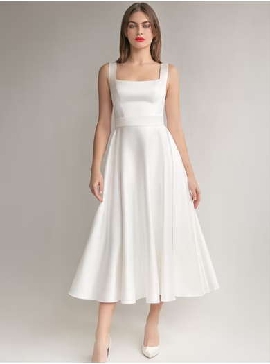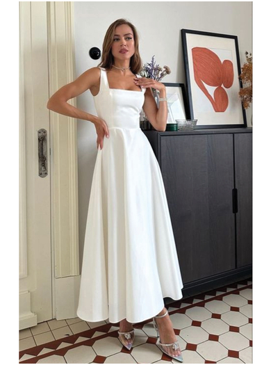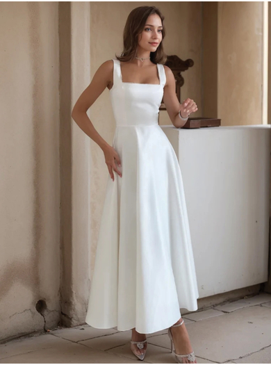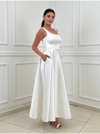 Sodobna poročna obleka, izdelana iz satena, se ponaša s tričetrtinsko dolžino, ki ji doda poseben čar. Eleganten dekolte oblikovan v črki U, dodatno poudari ženstvenost in eleganco obleke.