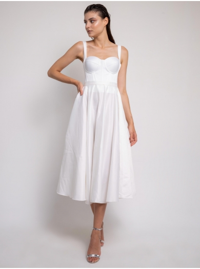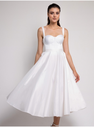 Elegantna in trendna satenasta poročna obleka v »midi« dolžini navdušuje z lepo poudarjenim životcem in mehko padajočim krilom, ki ustvarja prefinjen in sodoben videz.