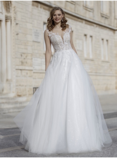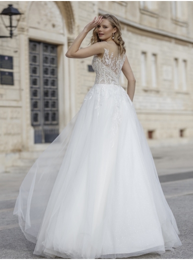 Romantična poročna obleka A-linije očara z životcem, prepletenim z nežnimi 3D čipkastimi cvetovi, ki ustvarjajo bogato teksturo in prefinjen videz. Večplastno krilo z nežnimi čipkastimi aplikacijami lahkotno pada in dodaja pridih pravljičnosti.