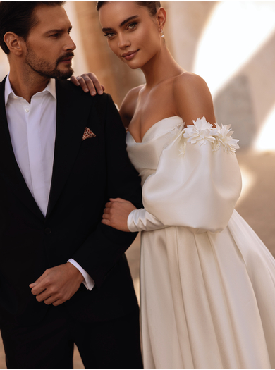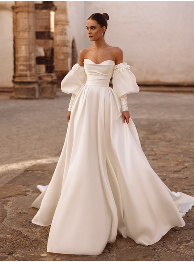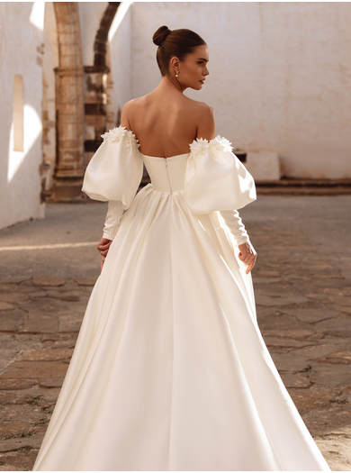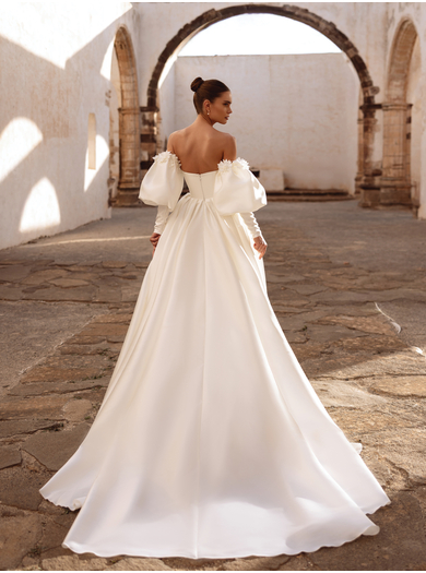 Modni poudarek obleke so voluminozni rokavi, ki dodajo dramatičnost in sodobno razkošje, medtem ko elegantno padajoče krilo z vlečko zaokroži celoten videz z veličastnim pridihom.