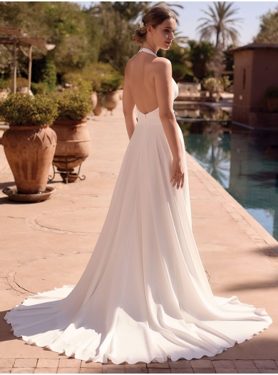 Elegantna poročna obleka z odprtim hrbtom, halter izrezom in mehko padajočim krilom s sprednjim razporkom. Plise detajli v pasu oblikujejo postavo, zadrga in gumbi poskrbijo za popolno prileganje. Rahla vlečka in neprosojna tkanina dodata piko na i brezčasni eleganci.