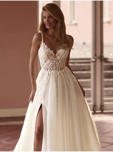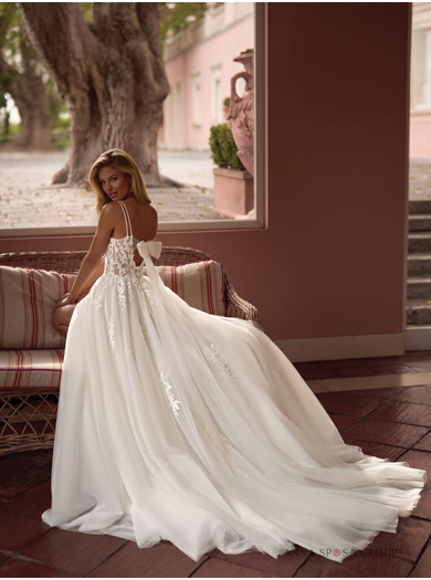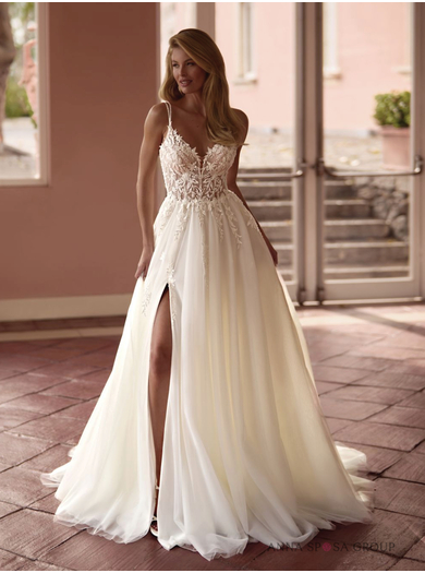 Zgornji del krasijo fini čipkasti elementi, pletena mrežica in prosojna tkanina, ki skupaj ustvarjajo prefinjen korzet s tankimi naramnicami. Čudoviti cvetlični vzorci, bleščice in ročno prišiti biseri dodajo subtilen sijaj in poskrbijo za pridih razkošja.