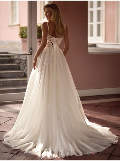 Očarljiva A-linijska poročna obleka v barvi ivory je popolna izbira za neveste, ki si želijo brezčasne elegance z lahkotnim in igrivim pridihom.