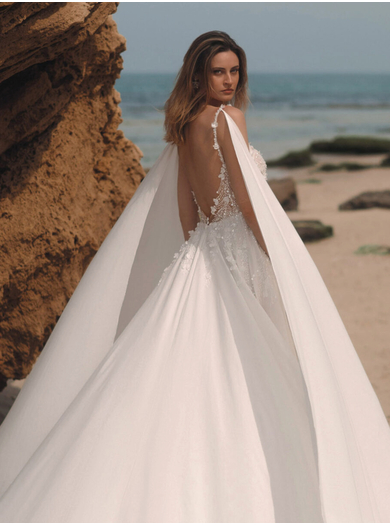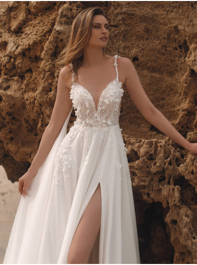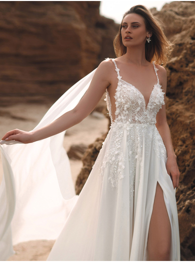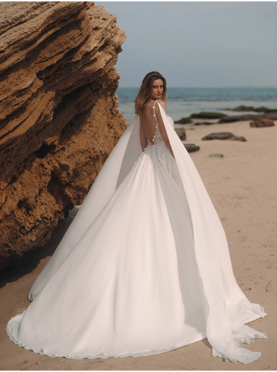 Krilo iz lahkotnega in zračnega šifona se čudovito giblje ob vsakem koraku, zapeljiv razporek pa doda drzno noto. Poseben poudarek obleki daje unikaten snemljiv dodatek – tančica ali šal – ki ga lahko prilagajate svojemu stilu in ustvarite dve različni podobi s samo eno obleko.