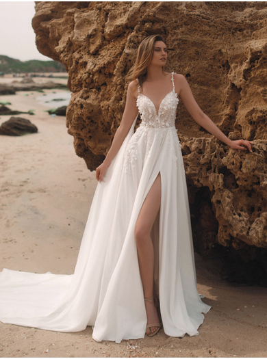 Ta čudovita poročna obleka v padajočem kroju združuje brezčasno eleganco z modernimi detajli. Zgornji del v srčasti obliki s tankimi naramnicami nežno poudari dekolte, medtem ko čipkaste aplikacije ustvarijo pridih romantične prefinjenosti.