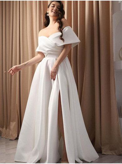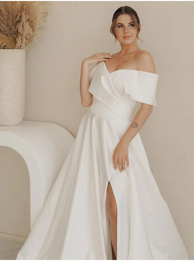 Brezčasna poročna obleka kroja A-linije s spuščenimi naramnicami izžareva eleganco in prefinjenost. Izdelana je iz kompaktne tkanine taffeta, ki navdušuje s svojim rahlo sijočim videzom in je eden izmed vodilnih trendov v novih poročnih kolekcijah. Zapeljiv razporek poskrbi za pridih drzne ženstvenosti, hrbtni del pa dopolnjuje praktična zadrga.