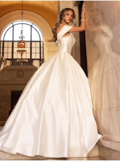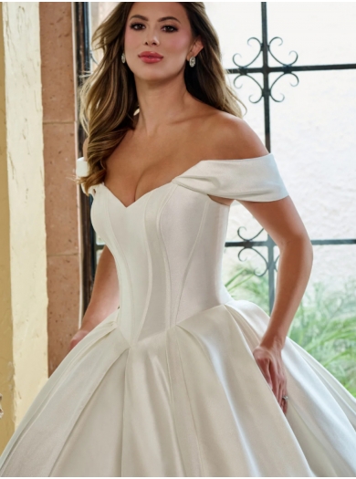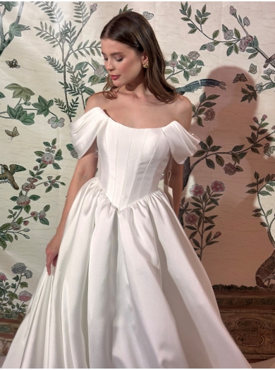 Elegantna poročna obleka off shoulder izreza navduši s čisto linijo, ki čudovito poudari dekolte. Bogata matirana mikado tkanina doda prestižen videz. Popolna obleka za brezčasen videz neveste.