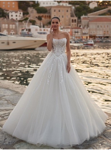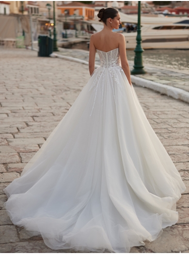 Zgornji del krasijo fini čipkasti elementi, pletena mrežica in glitter tkanina, ki skupaj ustvarjajo prefinjen modno oblikovan korzet. Čudoviti cvetlični vzorci, bleščice in ročno prišiti biseri dodajo subtilen sijaj in poskrbijo za pridih razkošja.