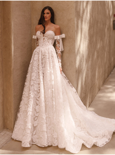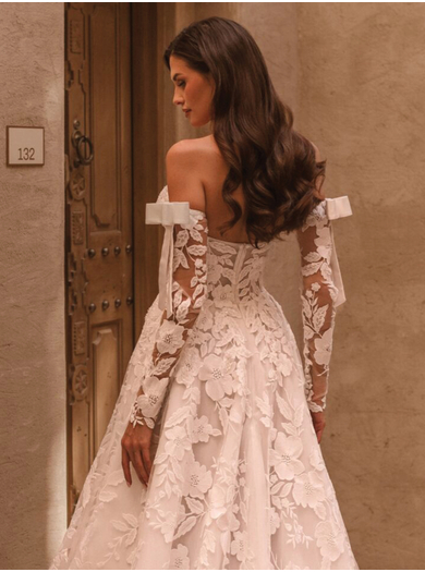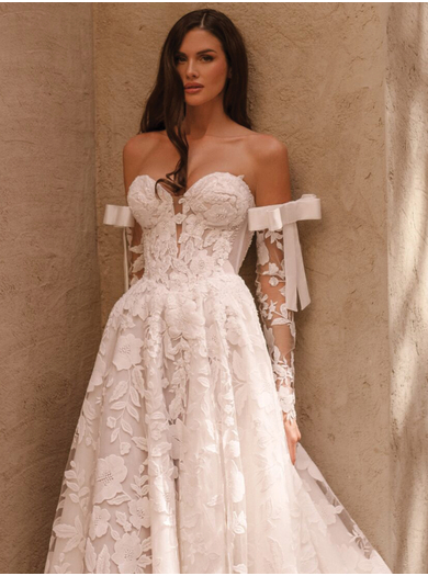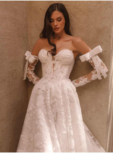 Romantična poročna obleka v A-linijskem kroju, ki združuje brezčasno eleganco in sodoben dizajn. Zgornji del je oblikovan v srčasti izrez, ki lepo poudari dekolte in doda ženstven pridih. Posebnost obleke so modni rokavi, ki se zaključijo z igrivimi pentljami, s čimer ustvarijo trendovski videz.