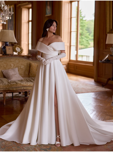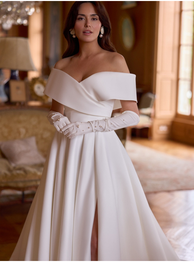 Elegantna in minimalistična poročna obleka iz gladkega satena navduši s čisto A-linijo in prefinjenim off-shoulder izrezom, ki čudovito poudari dekolte. Hrbtni del očara s korzetnim zapenjanjem, ki dodaja pridih zapeljivosti in romantične elegance.