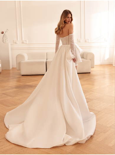 Dva videza v eni obleki: zapeljiva mini silhueta ali razkošna dolga podoba – ta poročna kombinacija je idealna izbira za neveste, ki si želijo nekaj drugačnega in si upajo izstopati.