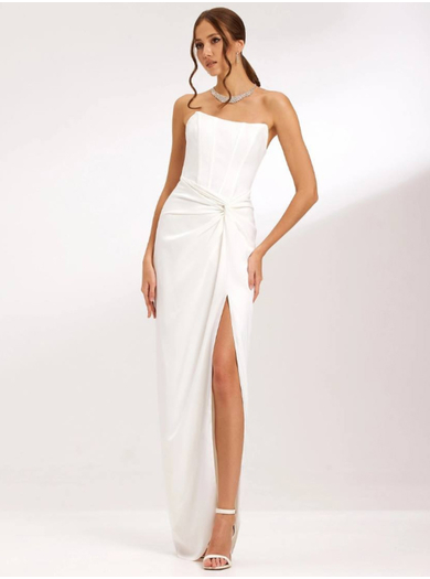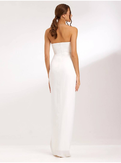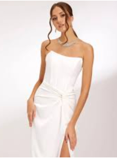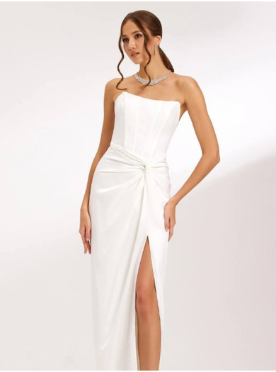 Elegantna poročna obleka oprijetega kroja z modno oblikovanim životcem in drapirano pasno linijo, ki čudovito poudari postavo ter optično zoža silhueto. Razporek dodaja pridih zapeljivosti in lahkotnosti.