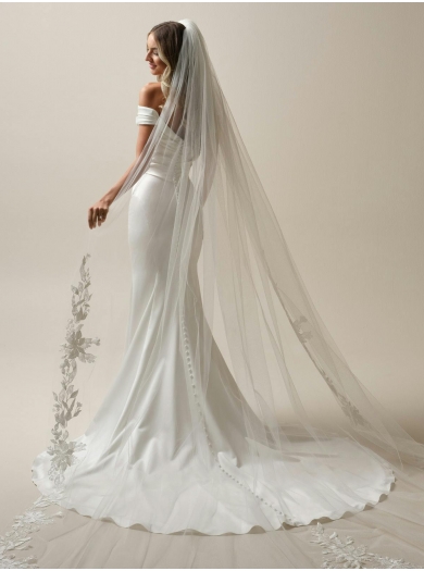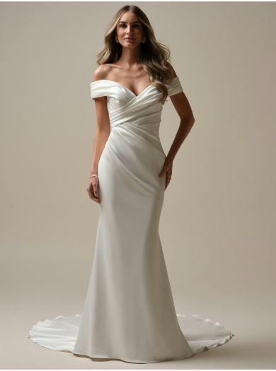 Ta oprijeta obleka sodobnega kroja je popolna izbira za neveste, ki prisegajo na čistost linij in brezčasno eleganco. Izrez off-shoulder nežno razkrije ramena ter doda pridih prefinjene ženstvenosti, medtem ko preprosta silhueta brez odvečnih detajlov odraža pravi čar minimalizma.